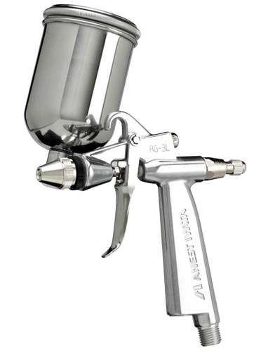 Contact UsThe RG3L round pattern air-spray gun requires only 1.1 cfm at 36 psi and produces remarkable atomization with precise control of the spray pattern. RG3L has ideal spray control when blending or shading. The compact lightweight guns are designed with side mounted gravity cup allowing 360° rotation giving the operator options to spray at a wide variety of angles.