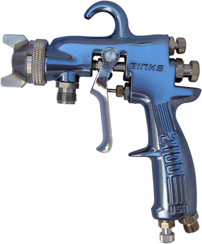 Contact UsNEW from BINKS, The next generation in conventional spray guns, the 2100 Series. Corrosion resistant SS fluid passages, Air Control Valve in Ergonomic handle, with new MAXIMUM DELIVERY air nozzles. Largest selection of air and fluid nozzles in the industry behind it, the Model 2100 will spray all conventional coatings, including high solids.