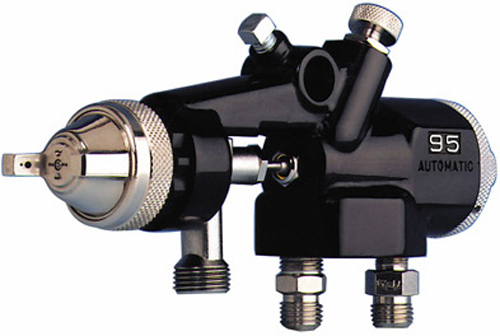 Contact UsThe Model 95A is a conventional spray gun that is pneumatically activated for applications with reciprocating, rotary, spindle machines and in stationary spray gun set ups. It is exceptionally rugged and is designed to stand up under hard, continuous use. 60 Series air and fluid nozzles are used in this spray gun. These nozzles provide spray patterns from a one inch spot to a wide fan with uniform coverage. All the fluid contact surfaces within the spray gun, including inlet, nozzle and needle, are constructed of stainless steel for use with waterborne as well as conventional coatings.