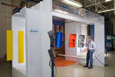 Exceptionally compact, Nordson Lean Cell® fast color change powder coating booth minimizes floor space and conveyor line gaps, and helps maximize production capacity and color-change speed.