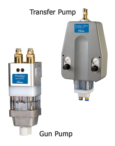 The Prodigy HDLV gun pump moves powder to the spray gun with less air velocity resulting in softer delivery, minimal overspray, higher transfer efficiency, and greater material savings.